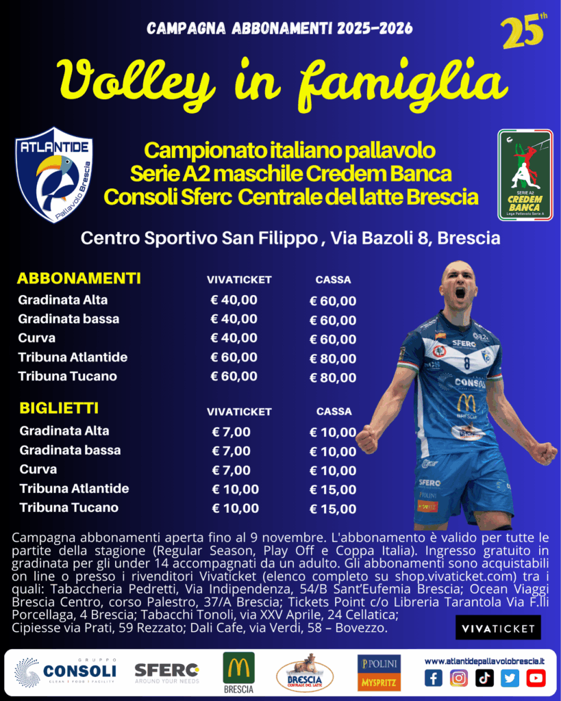 Brescia, 21 settembre 2025 – L’Atlantide Pallavolo Brescia compie 25 anni e invita alla sua festa che durerà una stagione intera, tutte le famiglie bresciane! “Volley in famiglia” claim della campagna abbonamenti 25/26 è contemporaneamente un invito ma anche il prezioso concetto chiave attorno al quale è nata e cresciuta la società bresciana sia a livello giovanile sia con la prima squadra. La società in più ha in cantiere alcune giornate speciali per i genitori ma anche per i nonni.
